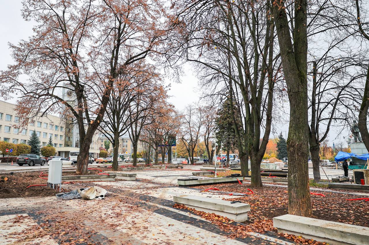 В сквере возле театра ведутся устройство уличного освещения и тротуаров, облицовка лавочек.