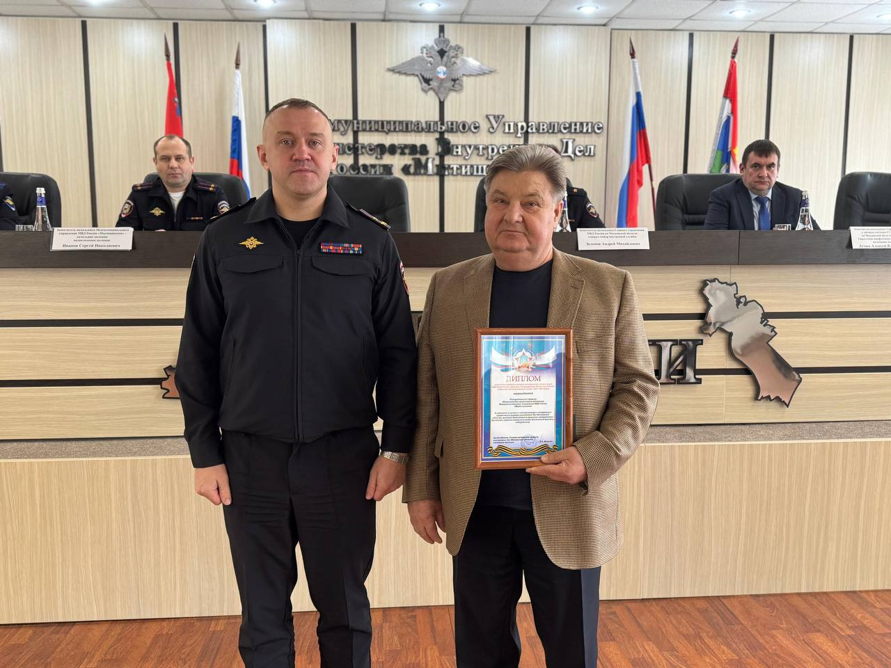 За активное участие в смотре-конкурсе ветеранских организаций ОВД Московской области, посвященном 80-летию Победы в Великой Отечественной войне дипломами награждены председатель Совета ветеранов полковник милиции в отставке Юрий Жигулин и заместитель председателя Совета ветеранов полковник милиции в отставке Владимир Пешев.