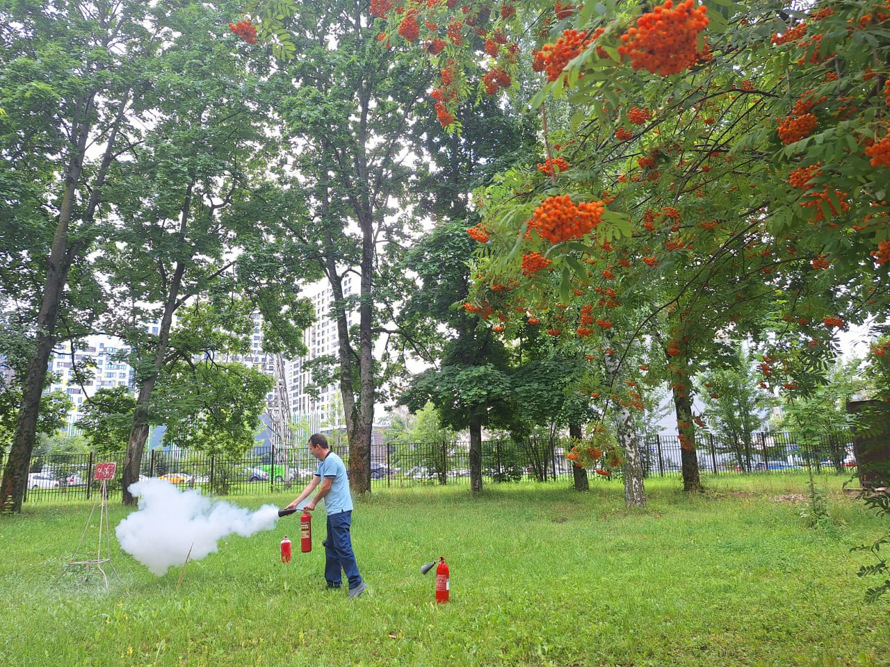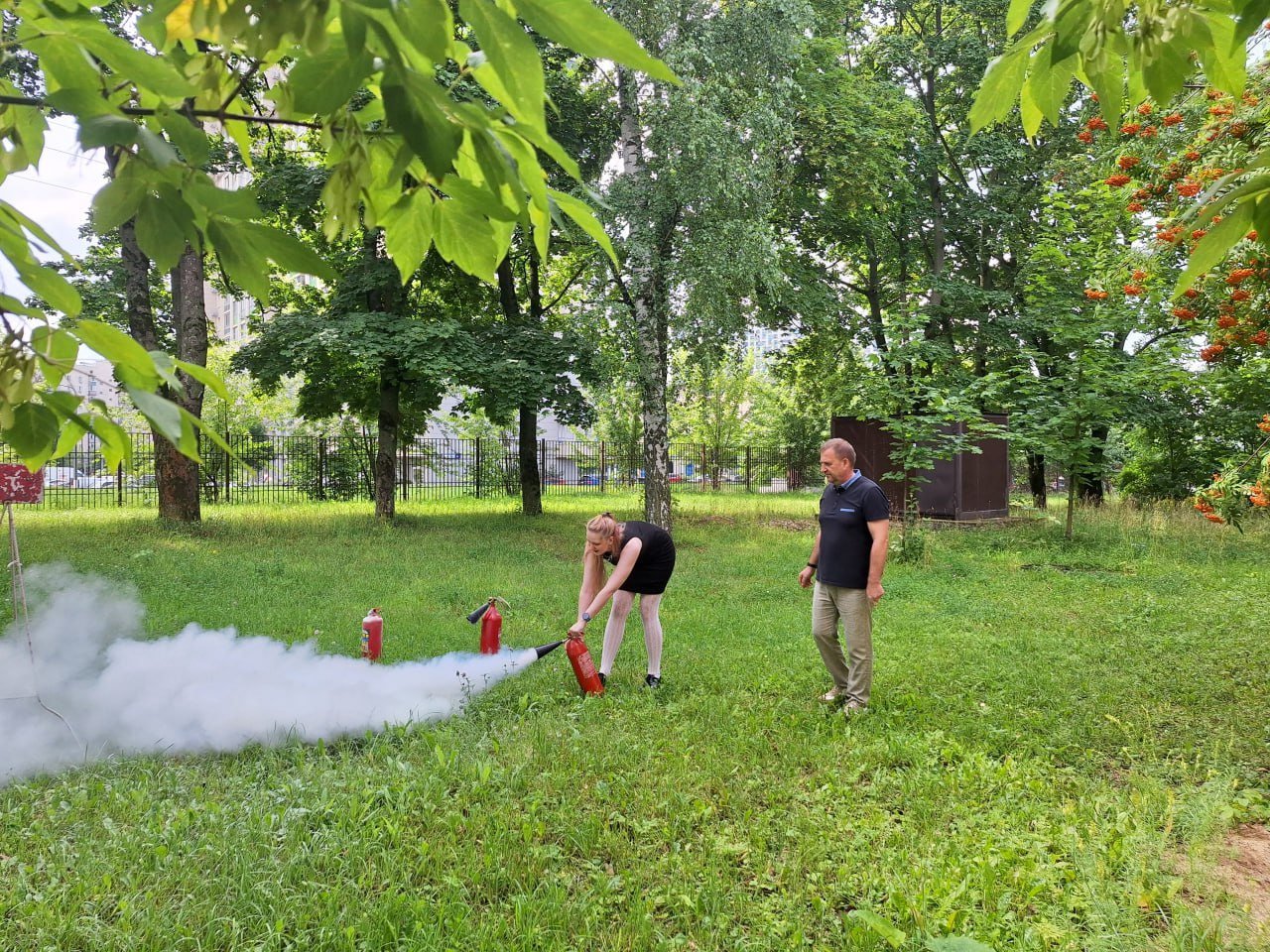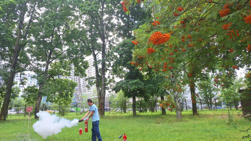 Ведущий специалист по противопожарной безопасности Дмитрий Гуньков показал, как пользоваться средствами индивидуальной защиты и огнетушителями. Сотрудники поочередно опробовали, как на практике применять порошковые и углекислотные средства пожаротушения.
