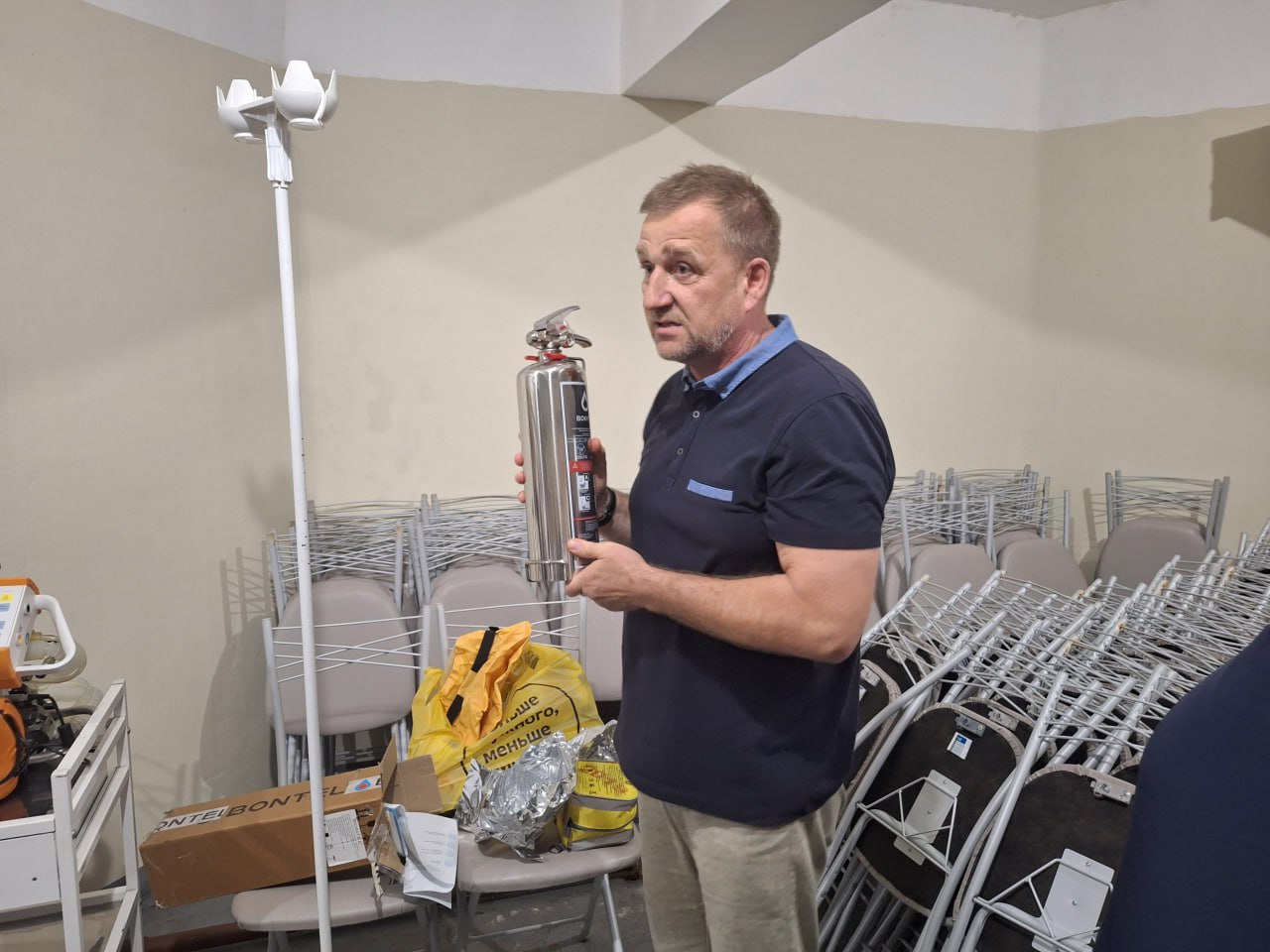В укрытии заведующая региональным сосудистым центром Мытищинской больницы врач-анестезиолог-реаниматолог Элеонора Тулякова продемонстрировала всем порядок проведения сердечно-легочной реанимации и первой медицинской помощи.