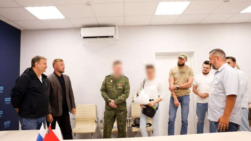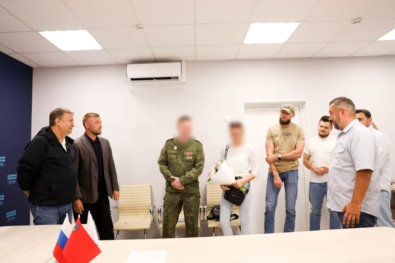 В местном отделении партии «Единая Россия» встретились с участником специальной военной операции, который находится в отпуске. На встречу боец с позывным «Урал» пришёл вместе с супругой.