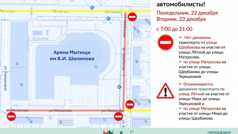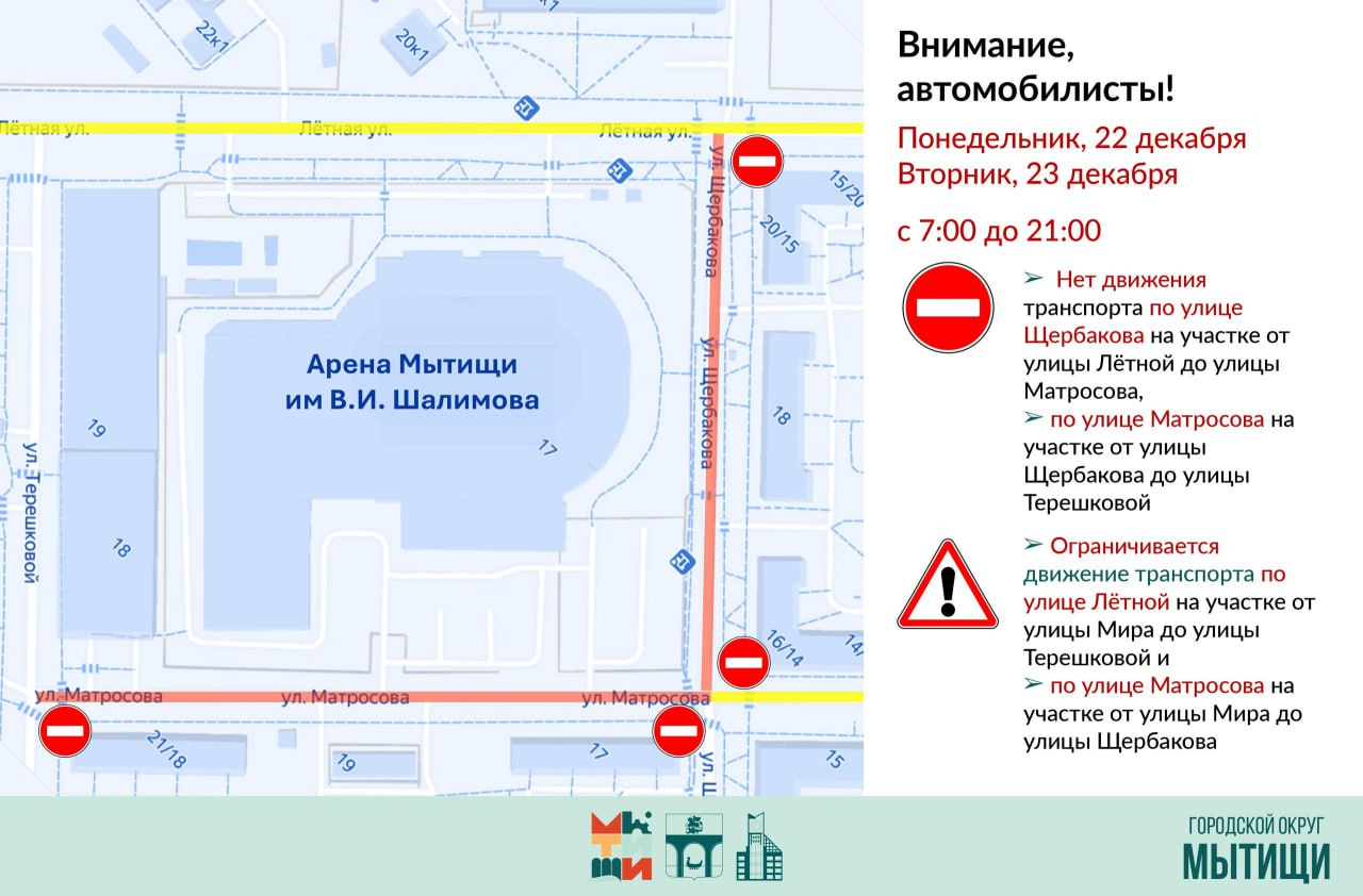 В связи с проведением Ёлок губернатора Московской области на территории городского округа Мытищи (Арена-Мытищи имени В.И. Шалимова) в целях обеспечения общественного порядка 22 и 23 декабря вводятся ограничения в движении автотранспорта.