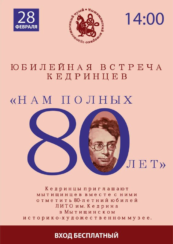 8 февраля в 14.00 кедринцы приглашают мытищинцев вместе с ними отметить 80-летний юбилей ЛИТО им. Кедрина в Мытищинском историко-художественном музее.