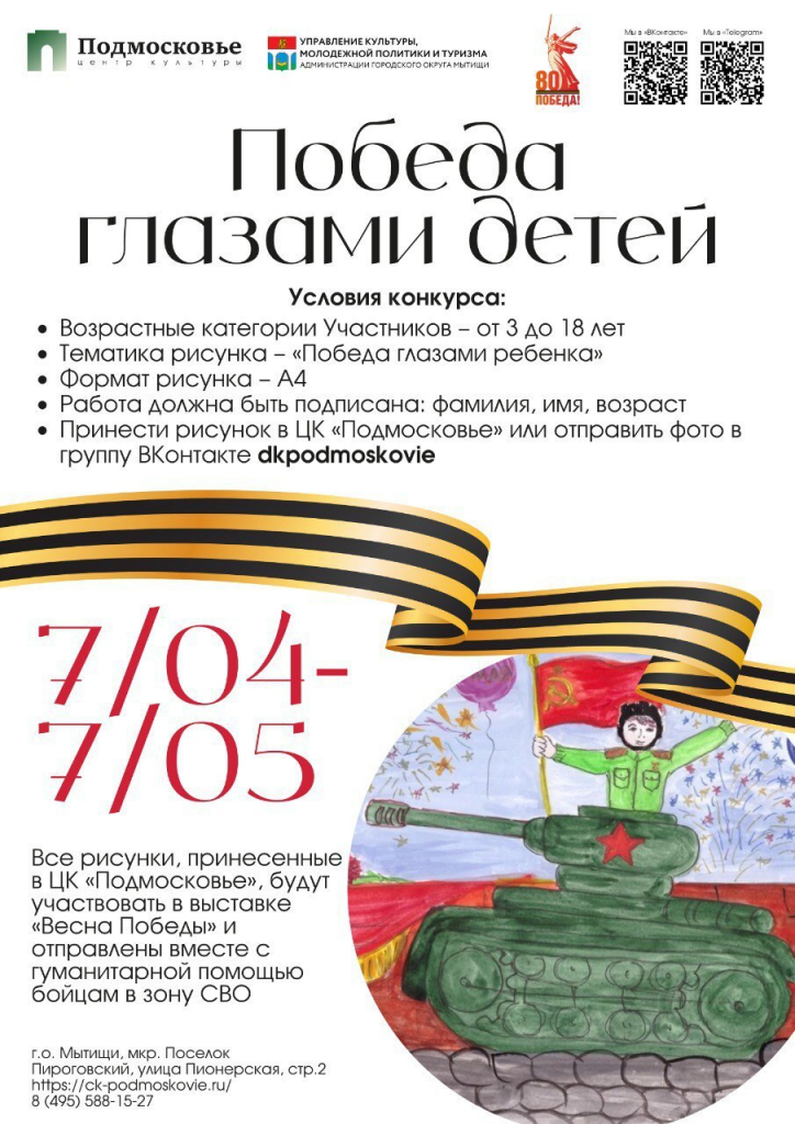 Центр культуры «Подмосковье» продолжает прием рисунков на конкурс, приуроченный к празднованию 80-й годовщины Победы в Великой Отечественной войне.