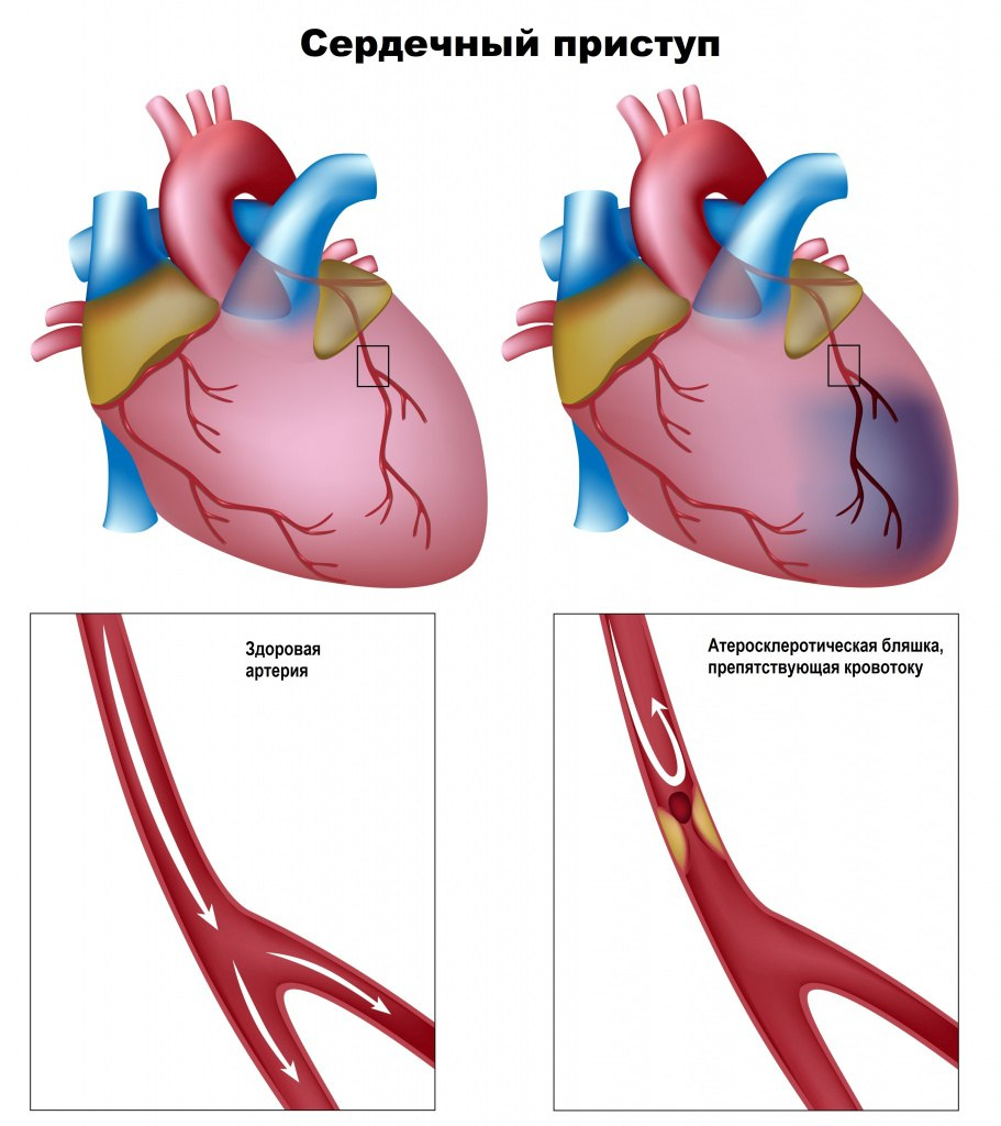 Инфаркт миокарда – острое проявление ИБС. Происходит спазм и закупорка сосуда, питающего сердце, кровоснабжение в органе резко сокращается, а без получения кислорода и питания клетки сердечной мышцы начинают отмирать. Инфаркт миокарда является угрожающим жизни состоянием и требует неотложной медицинской помощи.