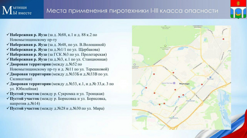 Кстати, за нарушение правил предусмотрена серьезная ответственность, вплоть до лишения свободы, об этом мытищинцам стоит помнить. Запрет на применение пиротехнических изделий распространяется на следующие адреса: